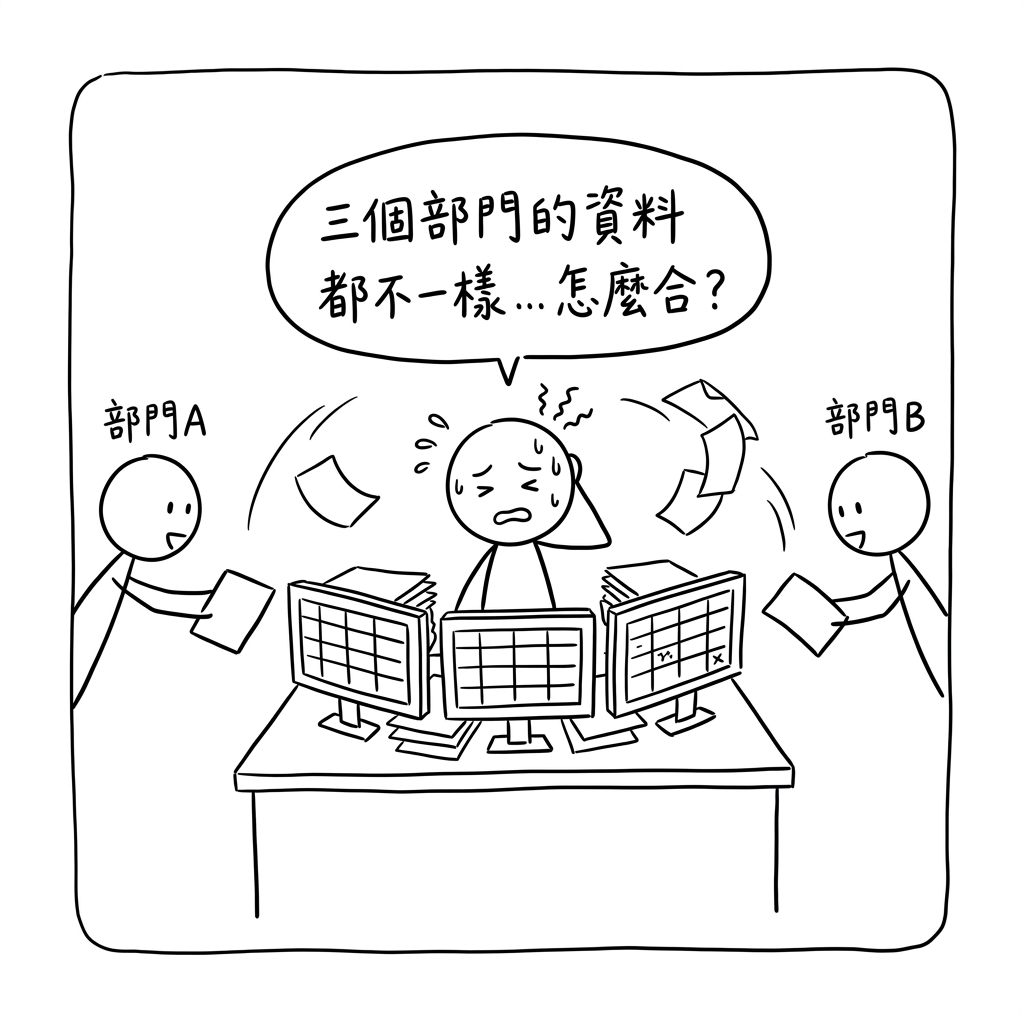 身為行銷企劃,每週要從業務、倉管、財務各拉一份資料做行銷報告。格式每次都不一樣,合併就出錯。會議上報告數字對不上,場面很尷尬。