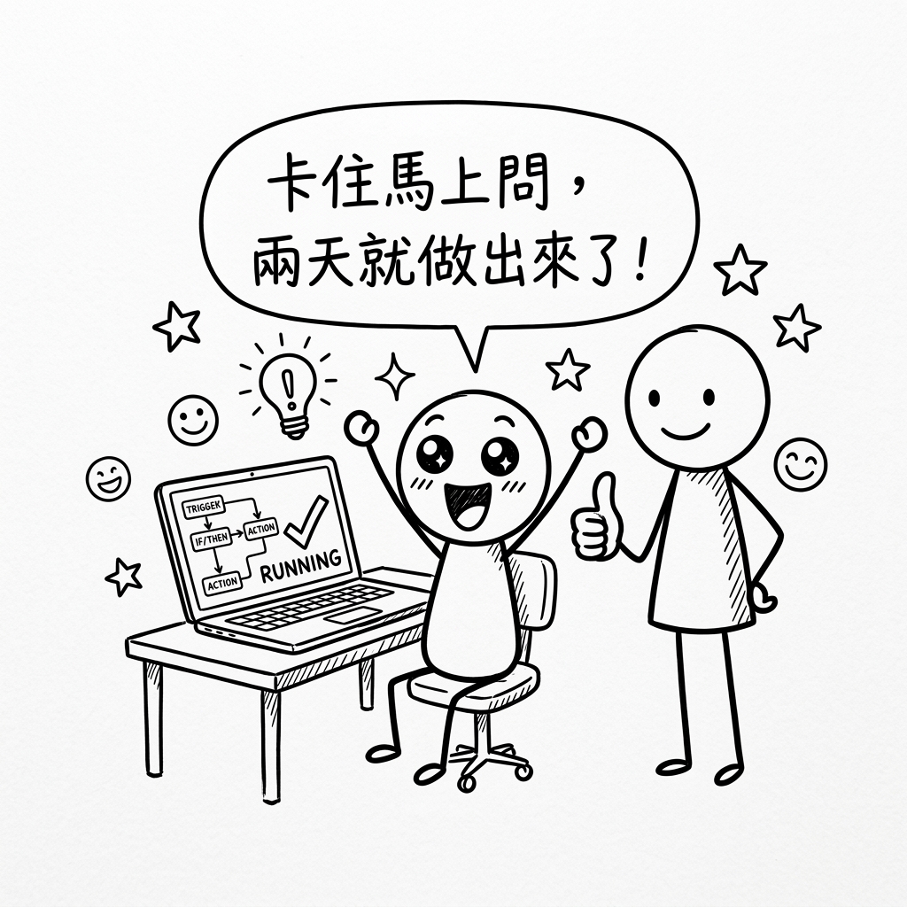 實體課最大的差別就是「卡住馬上有人幫」。兩天下來我做了一個完整的客戶資料自動建檔 + 通知流程,回公司第一天就用上了。同事看到都說太神了。